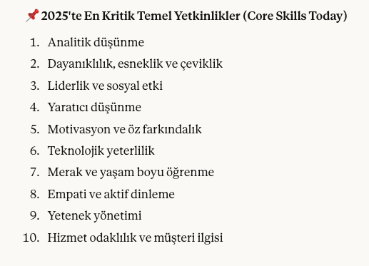 Analitik düşünme bile listenin ruhuna bakınca salt hesaplama değil, bağlamı anlama ve anlam çıkarma anlamında kullanılıyor — ki orada da insan deneyimi devreye giriyor.